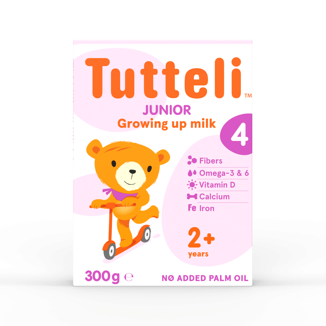 - TutteliTM 4 Junior sudėtyje yra skaidulinių medžiagų, Omega 3 ir 6 riebalų rūgščių, vitamino D, kalcio ir geležies.